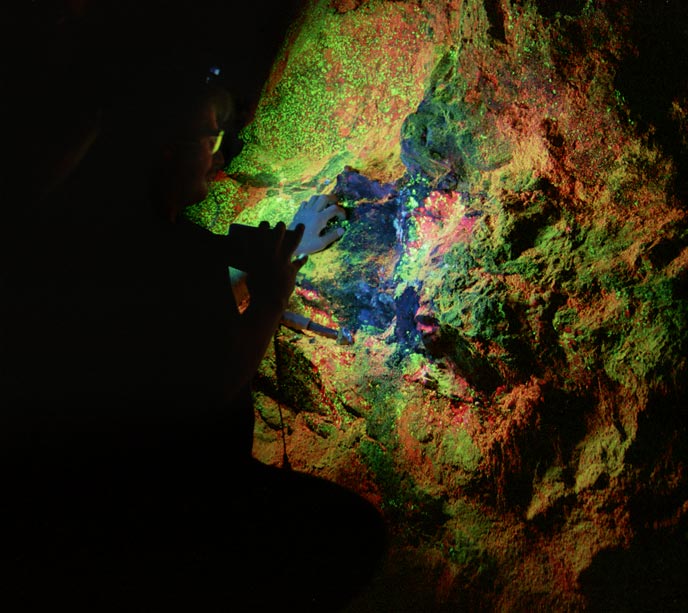 Greg Lesinski Greg Lesinski works a vein of electric blue hydrozincite. (See the rest of the story in the Trotter 2000 section of Photos) |